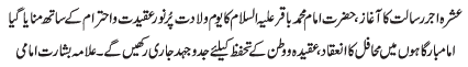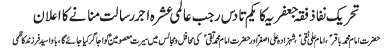 | RAWALPINDI, December 22: On the call of the TNFJ, Ashare Ajre Rasalat begins; the "Youme Baqir Alaloom (AS)" will be celebrated on Monday - Professor Bukhari | ||