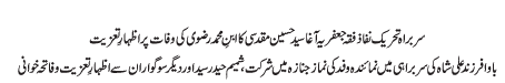 RAWALPINDI, December 18: The chief of the Tehreek Nafaz e Fiqh e Jafariya Allama Agha Syed Hussain Muqadasi expressed his grief over the sad passing of Ibne Mohammad Rizvi |