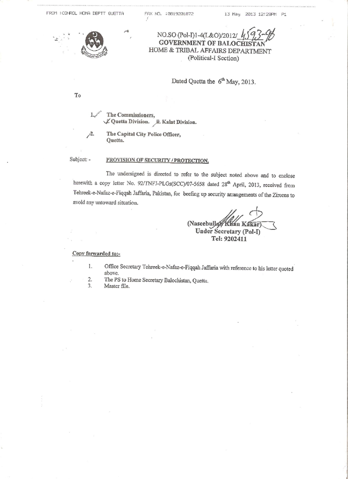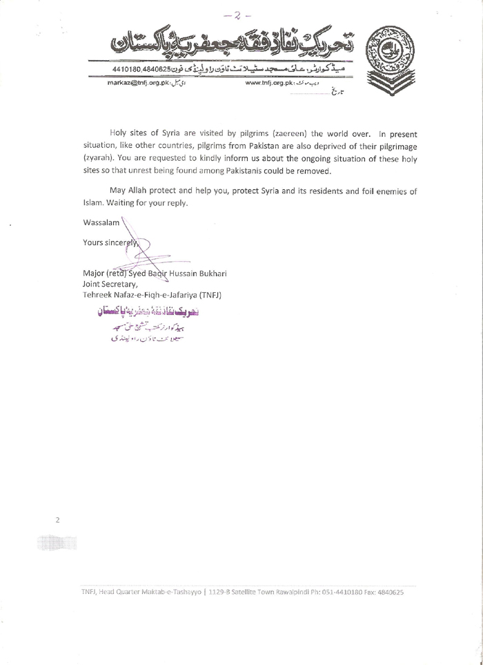The reward of visiting the Holy Sites of Islam By Abu Ruzab Haider The benefactor of the both world, the Holy Prophet of Islam (PBUH & HHP) said, “whoever visited my grave after my demise it is as if he met with me in my life” (Ref Sanan Dar Kutni Vol. 2 p278). For the same reason and according to the true traditions of the Holy Prophet (PBUH & HHP) the pilgrims of the holy places of the pious personalities of Islam are recommended and are source of reward. Thus Hazrat Abuhuraera (RA) says that once the Holy Prophet (PBUH & HHP) was going on his way when he was near to the graves of the martyrs of the battle of Uhad, said, “I witness that they are in the court of Almighty Allah are martyrs on the Day of Judgement therefore you should pilgrim their graves and pay your respect. By Lord, who has a control over my life, until the Day of Judgement, whoever offer them salutation they will reply to them”. (Ref Mustadrak Hakim Vol. 2 p248). The lady of heaven, Hazrat Fatima Zahra (PBUH), every Friday used to visit the grave of her uncle Hazrat Hamza (PBUH), prayed there and used to shed tears over the martyrdom of her uncle (Ref Sunan Behaiqee Vol 4 p78). It is the teaching of the Holy Quran that whatever the Holy Prophet of Islam (PBUH & HHP) ask you to do, act upon it and what ever he refrain you from, be refrained. The Holy Prophet (PBUH & HHP) considered the love towards his holy Progeny (PBUT), a reward of his Prophethood and a condition of being faithful; therefore it is your saying that, “you should make upon yourself compulsory, the love towards my progeny (PBUT) because whoever met with Almighty Allah (passes away from this world) in the condition that he had a love towards my holy progeny (PBUT) then he will enter into heaven with the help of my intercession; by Lord, who has control over my life no one will benefit from their deeds unless he is aware of our rights”. For the same reasons, as from all parts of the world, the pilgrims form Pakistan go to Makka Mukarma, Madina Munawara, Najaf Ashraf, Karbala Mualla, Baghdad Sharif, Samra, Qum al Muqadsa, Mash’had al Muqadsa, Iran, Iraq, Syria, Jordan and other holy places and consider this act a source of great reward. In the beloved homeland Pakistan where no one is safe from terrorism, the pilgrims were not spared either therefore those who go on pilgrim via Quetta Balouchistan were made victim of terrorism which is witnessed by many incidents, especially the incident of Mastong. The Tehreek Nafaz e Fiqh e Jafariya, on the directives of the Quaid e Millat e Jafariya Agha Syed Hamid Ali Shah Moosavi, wrote a letter to the federal and the Balouchistan governments to beef up the security of the pilgrims so that they can go for pilgrimage without any fear and is published here for information purpose.