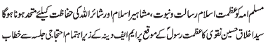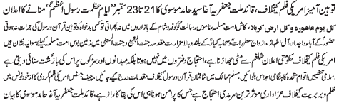 RAWALPINDI, September 21: Moosavi announces the observation of Ayyam e Azmat e Rasool e Azam from 21- 23 September to protest against the blasphemous film | |||