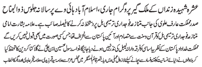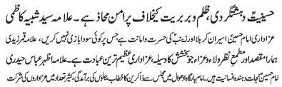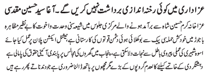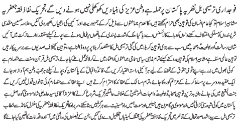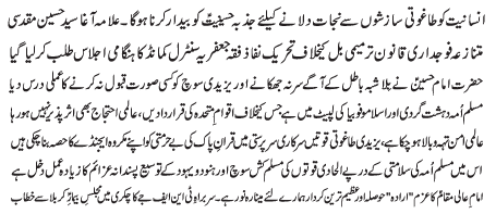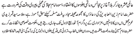 ISLAMABAD, August 2: Tehreek Nafaz e Fiqh e Jafariya appreciates all classes of societies and the administrations for peacefull completion of first ten days of Ayyam e Aza |
