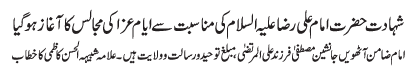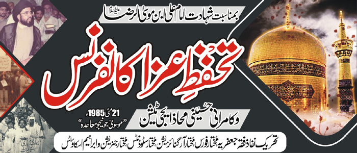 ISLAMABAD, May 13: TNFJ announced the observation of Ayyam e Aza to amrk the martyrdom of Imam Ali Raza (AS) from 21-23 Zeeqaad |