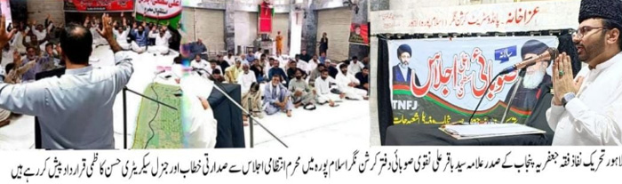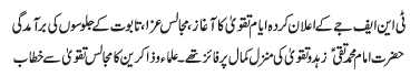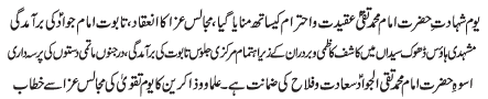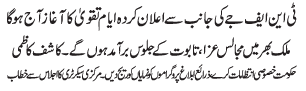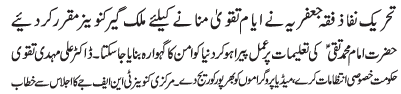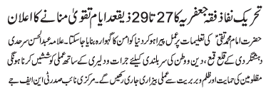| ISLAMABAD, May 23: The Tehreek Nafaz e Fiqh e Jafariya announced the observation of the "Ayyam e Taqwa" from 27-29 Zeeqaad | ||