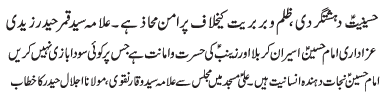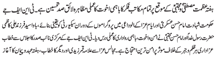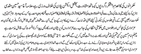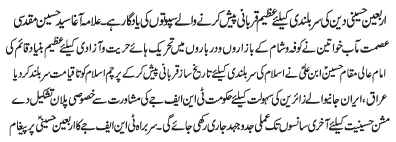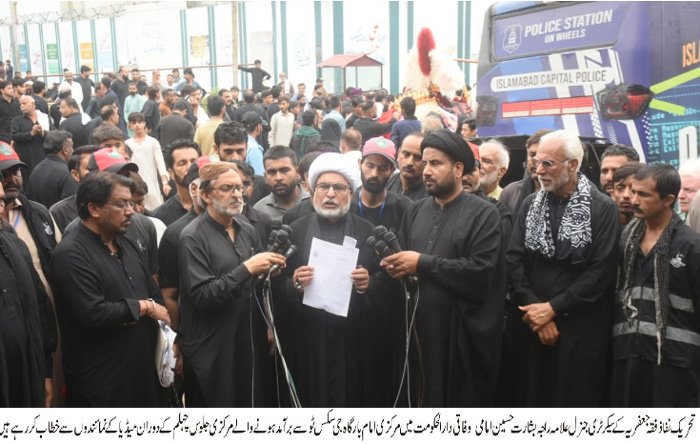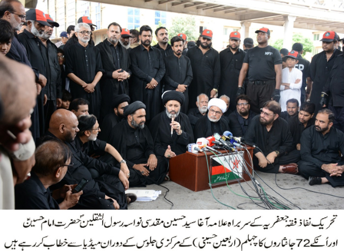 ISLAMABAD, June 27: The Chief of the Tehreek Nafaz e Fiqh e Jafariya, Allama Syed Hussain Muqadasi announced 16 points code of Azadari in the beginning of Muharram |