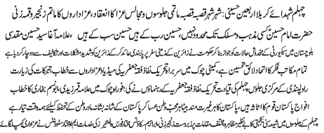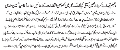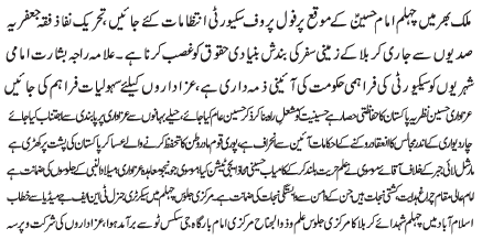 ISLAMABAD, August 12: Especial security arrangements must be ensured during Chehlum Shuhadae Karbala Arbaean e Hussaini - Hussain Muqadasi |