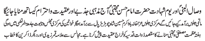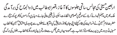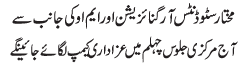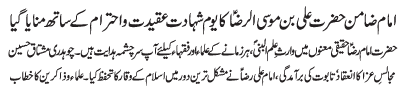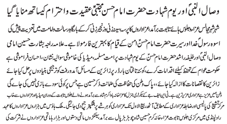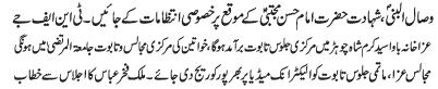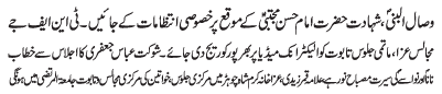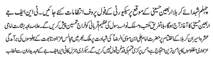RAWALPINDI, August 22: Coverge must be given on the electronic and print media of the Majalis e Aza and the matami processions of the Wasal un Nabi (SAWW) and the Shahadat of Imam Hassan e Mujataba (AS) - TNFJ | ||