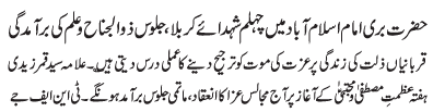 RAWALPINDI, August 1: Ashura and Arbaean are the remembrance of the great sacrifice of Imam Hussain (AS) | ||