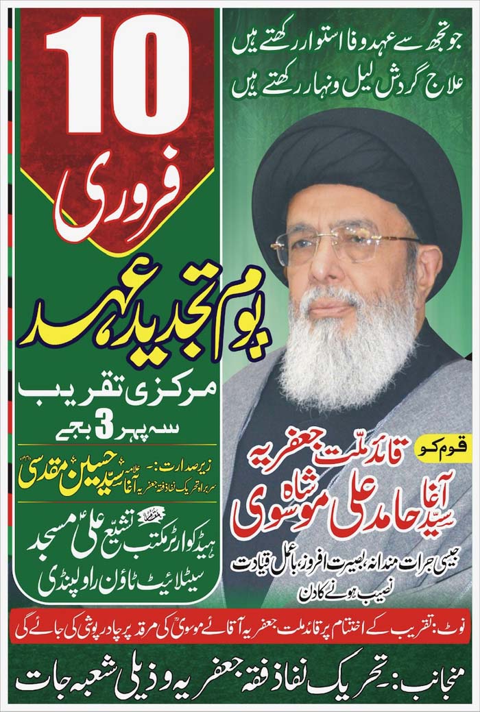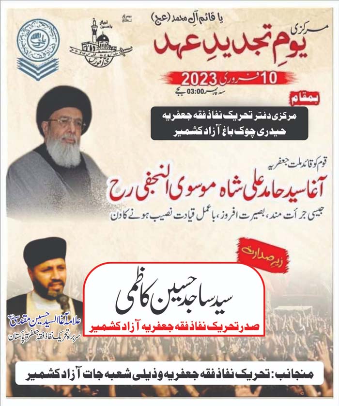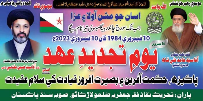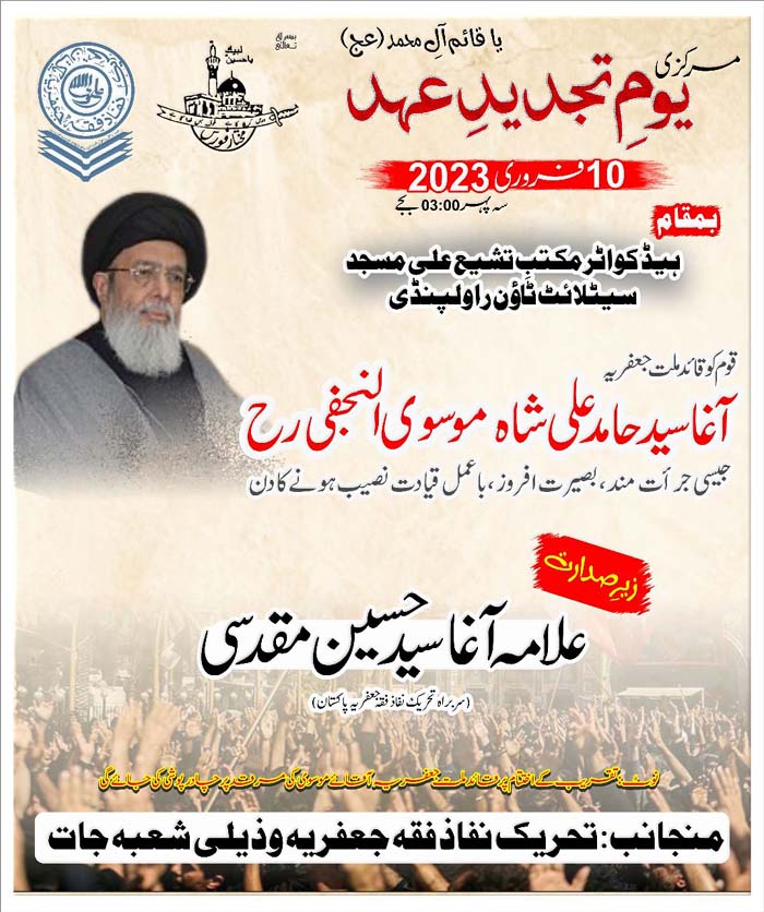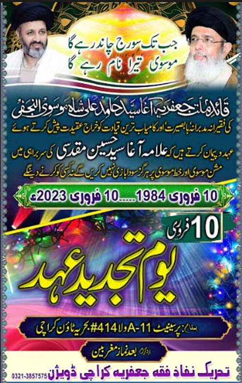 TNFJ and its Sub Organizations are observing the "Tajdeed e Ehad" on 10 February 2023 to mark the leadership of the Quaid e Millat e Jafariya Agha Syed Hamid Ali Shah Moosavi (10 Feb 1984 to 2023)