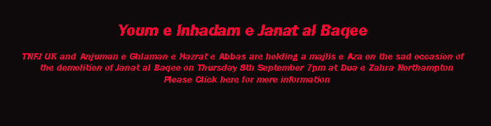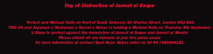 RAWALPINDI, September 8: On the occasion of Youm e Inhadam e Jannat al Baqee, Majalis-e-Aza were held and protest Matmi processions were taken out in all big cities and towns including Rawalpindi and Islamabad; The only solution of all problems confronted by the Muslim Ummah is to get the dignity of Jannatul Baqee and Jannatul Moalla restored