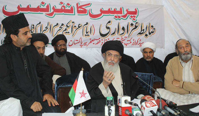 The Chief of the TNFJ Agha Syed Hamid Ali Shah Moosavi has announced that the 19-point Code of Azadari RAWALPINDI, October 27: Chief of the Tehreek Nafaz Fiqh-e-Jafariya Quaid-i-Millat Jafariya Agha Syed Hamid Ali Shah Moosavi has announced that the 19-point Code of Azadari for Muharramul Haram. Matmi processions all over the country will be taken out independently under the May 1985 Junejo-Moosavi agreement and no hurdle will be borne in this connection. Army and Rangers may be deputed at sensitive places during Muharramul Haram while the Muharram Control Rooms may be set up at Federal Interior Ministry and in provinces and they may be director to keep in contact with the TNFJ Muharram Committee Azadari Cell. Action may be taken against banned groups for rooting out terrorism. India is our perpetual enemy while Iran is long-standing friends and these both may not be analysed with on similar scale while foreign policy may be reformed. Iran has supported Pakistan in every difficult moment and reasons for keeping a distance with Iran may be reviewed. Operation Zarb-e-Azb should have been launched much earlier and now the nation should fully support it, more over there is also need of a similar operation in Quetta. We don’t recognize sit-in but to die for Muhammad (SAAW) and Aal-e-Muhammad (A.S.). Why those who cry hoarse of Sahaba are silent on the destruction of graves and shrines of pious Sahaba Kubaar and Ahle Bait Athaar (A.S). Those are opposed to Matmi processions are themselves taking our procession. Terrorism is the requirement of rulers and international establishment the biggest example of which is formation of Daish at the hands of America and Zionists. Attack on Fazlur Rehman was the result of owing to Kashmir Committee. New provinces can be made keeping the country’s integrity and brotherhood under the Pakistan’s Constitution. The Government of Pakistan should exert diplomatic pressure for the release of Ayatollah Baqar Al-Nimr. In all State institutions including the Ideology Council, those people are given representation who are against the creation of Pakistan. We will not let any efforts to turn Pakistan into a Maslaki State. He expressed these views at a huge Press conference at the headquarters of the Maktab-e-Tashih while announcing the Code of Azadari. A large number of UlemaKaraam and TNFJ leaders were present on this occasion. Agha Moosavi said that they are remembering the Nawasa-e-Rasool (A.S.) in Muharramul Haram in a situation where Yazidi forces are seen all around, there is no Muslim State where terrorists were not making the life of people difficult, the worst of it is that Islam is being attached with terrorism and groupism. Wherever the riot and terrorism is, Islam and Muslims are being blamed for it. The international Satan first presents some jihadis as Mujahids for her self-interest and when her interest is fulfilled she declares them terrorists and destructs their countries, Kashmiris and Palestinians are being killed in one garb or the other, Pakistan is the target of international chief of terrorists and their agents for the last three decades even at present our frontiers, Working Boundary and areas close to the Line of Control are being violated unprovoked by the Indian army and skirmishes are going on. The TNFJ chief said that the enemy has seen that a large number of Pakistan’s Armed Forces were busy in Waziristan Operation and are posted in Swat, Karachi and areas close to the Afghan borders, helping out the flood affected. Keeping in mind that the army is busy in internal matters, the enemy was carrying out mortar attacks on our citizens. Indian Prime Minister desires to get the Working Boundary recognised as international border. In these circumstances we all are under the obligation to support the Pakistan’s Armed Forces on priority basis and become a concrete wall against the enemy so as to thwart every conspiracy of her. Agha Moosavi said the need of the hour is that Muslims and all Masalik should derive guidance from Quran that is the source of all Islamic teachings, Rasool’s (SAAW) Sunnah, sayings of Ahle Bait Athaar (A.S.) and pious SahabaKubaar, Syed-us-Shuhada Imam AaliMuqaam Hussain Ibne Ali (A.S.) and his near and dear ones who kissed Shahadat in Karbala and make all out efforts to disseminate the message of religious tolerance and mutual unity so as to end uncertainty, restore peace and tranquillity, and economic, social and political respite. That is the only way to thwart every evil design of the colonial powers. The oppressed world can be get rid of oppression by observing the days of Gham-e-Hussain (A.S.) under the flag of unity and brotherhood with honour and dignity. He announced the 19-point Code of Azadari in connection with the oncoming Muharramul Haram Ayyam-e-Aza that is as given below: (1) Before time strong and stable steps be taken during the Majalis and Azadari procession at sensitive places and squads of Army and Rangers be posted. In addition to general vehicles the public vehicles also be checked, participants of procession by facilitated, checking of women be carried out through ladies’ police. (2) CCTV cameras and walk-through gates be installed at the internal and external paths to Majalis and processions, hurdles be installed with some distance for the protection of Majalis and Azadari processions and special watch on high-rise building be made, video film be made of all Majalis and processions and patrolling by police mobile squads, Elite Force be ensured for the protection of processions; (3) Cooperation be sought from Ibrahim Scouts and Mukhtar Force along with police in security matters; (4) Caretakers and administration of Imam bargahs arrange protective measures themselves also. Azadaran are under the obligation to give priority to Azadari over all other matter. Centre and provinces not imposed any such law that may encroach upon the rights of the Azadaran; (5) In the light of May 21, 1985 Jun