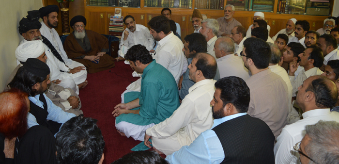 Agha Moosavi demanded from the government to tighten noose around banned groups so as to root out terrorism from the country ISLAMABAD, July 22: The Patron-in-Chief of Supreme Shia Ulema Board Quaid-i-Millat Jafariya Agha Syed Hamid Ali Shah Moosavi has demanded from the government to tighten noose around banned groups in real terms so as to root out terrorism from the country and for the final success of the Operation Zarb-e-Azb launched by the Pakistan’s Armed Forces and the National Action Plan. These elements have been rejected by the people despite they were allowed to contest the recent elections in Gilgit-Baltistan, he added. Agha Moosavi lamented that these rejected elements were not only working with new names but were also seen sitting in TV talk shows and government programmes while poor religious leaders from different districts are being arrested and put in schedule-4 on the contrary which is tantamount to violation of the spirit of National Action Plan and sabotaging the Operation Zarb-e-Azb. This was stated by him while addressing the 72-member delegation of TNFJ Khyber-Pakhtunkhwa office-bearers and elite. Additional Secretary General of Tehreek Col. (Retd) Sakhawat Hussain Kazmi and other senior leaders were also present on the occasion while provincial secretary general KPK Zulfiqar Haider Jamil presented the organizational report. The TNFJ chief expressed heartfelt sympathies with the mourning families of the Army Public School Peshawar, Imam Masjid Hayatabad incidents and Shuhada of Pakistan’s Armed Forces. He demanded from the government to immediately arrest the assassins of all those who fell victims to incidents of terrorism in Quetta, Karachi, and elsewhere including that of TNFJ Khyber-Pakhtunkhwa president Sardar Abul Hassan Qazilbash’s brother Sardar Abid Hassan Qazilbash. Agha Moosavi said that in Pakistan Ali Masjid is the representative Markaz of ‘Wila’ and ‘Aza’ from where disseminating the righteousness in the light of teachings of Muhammad (SAAW) and Aal-e-Muhammad (A.S.) is our duty in faith. He said we have accepted poverty ourselves because there is a saying of the Masoom (A.S.) that a giving hand is better than the receiving hand. Our character is like an open book as neither our forefathers became afraid of worldly powers nor we or our future generations could be overcome with fear and made to bow down to their whimsical desires, he added. He said the role of Khadija’s (S.A.) wealth and sacrifices of Abu Talib’s (A.S.) offspring in strengthening the foundation of Islam cannot be forgotten. The Quaid-i-Millat Jafariya Agha Syed Hamid Ali Shah Moosavi said that everyone should keep it in his mind that righteousness has to emerge supreme at last and evil has to be rooted out, therefore, it is binding on all followers of Jafar Ibne Muhammad (A.S.) to keep in touch with the Markaz and give practical proof of being the supporter of the oppressed and expressing hatred against the oppressors by following the saying of the Amirul Momineen (A.S.). He advised them to follow the ‘Wila’ of Ali (A.S.) and ‘Aza’ of Hussain (A.S.) strictly that guarantee survival here and the Hereafter.