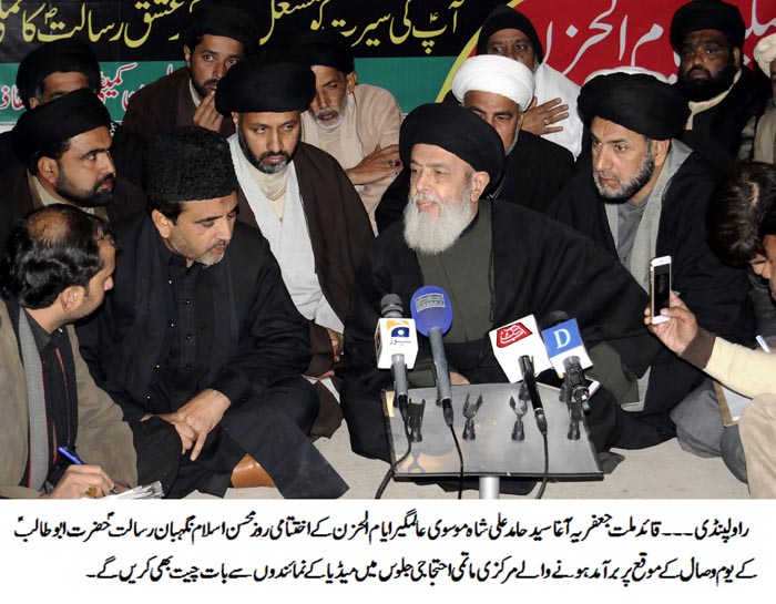 banned groups - Hamid Moosavi ISLAMABAD, December 28: The Patron-in-Chief of Supreme Shia Ulema Board and chief of Tehreek Nafaz Fiqh-e-Jafariya Agha Syed Hamid Ali Shah Moosavi has said that all those parties that are doing politics on the Quetta Inquiry Commission have friendship with banned groups. No one should react and Supreme Court should review it. The National Action Plan and Operation Zarb-e-Azb began in the era of Gen. Raheel Sharif, and the new Army Chief should go two steps forward towards that direction and begin operation in Punjab and Islamabad also. Negative propaganda is being done by posting fake pictures about ongoing war in Syria. All countries are fighting the war of their interests. Anti-Israel resolution by the outgoing Obama will make no difference. Hazrat Abu Talib (A.S.) was the protector of Rasool-e-Akram (SAAW) and his Nikah Khawan whose shelter was declared by Allah as His shelter in Quran. The method of offering sacrifice for ideology comes from Asswa-e-Abu Talib (A.S.). Pakistan was divided owing to four wars inflicted on Pakistan and the four martial laws and led to the sense of deprivation and it gave the gifts of Kalashnikov culture, terrorism and the rulers and politicians will have to display sincerity of purpose to root these out. These views were expressed by him while talking to Matmi Azadaran and media representatives while leading the central procession of twin cities of Rawalpindi-Islamabad taken out from Imambarah Zainul Abideen (A.S.) to mark the conclusion of the Universal Ayyam Al-Huzn to mark the Wisal of Nigehban-e-Risalat Hazrat Abu Talib (A.S.). He said after the World War-I, the British colonial powers under a conspiracy broke the Sultanate of Usmania into pieces and inducted their agents in Islamic States and on the soil of Hijaz the holy shrines of Rasool-e-Khuda’s (SAAW) forefathers, Aal-e-Athaar, Ummahatul Momineen and Sahaba Kubaar were razed to ground so much so that the holy shrine of Rasool’s (SAAW) mother Hazrat Amna (S.A.) was not spared as a result of which the hearts of devotees of the Rasool’s are heavy. The Quaid-i-Millat Jafariya Agha Syed Hamid Ali Moosavi said that Hazrat Abu Talib (A.S.) protected the Rasool-e-Khuda (SAAW) throughout his life. He not only brought the Rasool (SAAW) up but remained the defender of the Rasool-e-Khuda throughout his life and bore all types of difficulties but did not let anybody cause any harm to the personality of the Mustafa (SAAW). That is why he declared the year of Wisal of Hazrat Abu Talib (A.S.) and Hazrat Khadijatul Kubra (S.A.) as Aam Al-Huzn as a result of which the Rasool (SAAW) had to leave Makkah as there was no protector of him there anymore. He said the religion of Islam will always be thankful for Hazrat Abu Talib’s blessings. Meanwhile, dozens of Matmi Dastas, a large number of ulema, elite from religious organisations and thousands of Azadaran participated in the procession and paid pursa to the Hazoor-e-Akram (SAAW). |