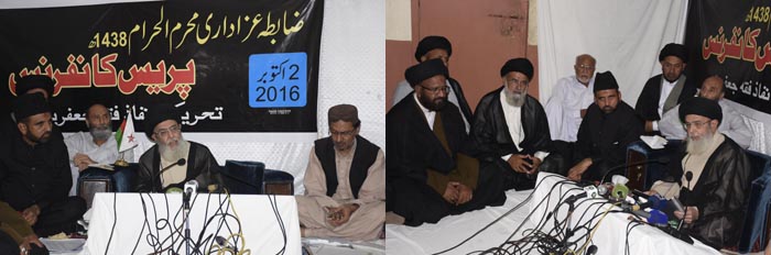 for the oncoming month of Muharramul Haram RAWALPINDI, October 3: The Patron-in-Chief of Supreme Shia Ulema Board and chief of Tehreek Nafaz Fiqh-e-Jafariya Agha Syed Hamid Ali Shah Moosavi has announced a 17-point Code of Azadari for the oncoming month of Muharramul Haram at a huge Press conferences address here at the headquarters of the Maktab-e-Tashih Sunday. Answering a question from the journalists, he said Azadari is the most effective protest against the oppressors and all Sunni-Shia brethren will observe the grief of the Nawasa-e-Rasool (SAAW) jointly. He said no restrictions were accepted in Azadari before nor will be accepted in future. He said war is no solution to the problems and if the Hindu Bunya did not desist then we would have to keep the relevant Quranic Ayah in front of us to give a befitting reply to the enemies. Raheel Sharif keeps the Haideri commitment and will not disappoint the nation. Azadari has grown under the shadow of swords, and we have no fear of Indian aggression as we will continue performing the chest-beating (Matam) even in the rain of explosives. All oppressors including India can be defeated through the Hussaini (A.S.) spirit, he added. Agha Moosavi said that heads of banned parties are roaming about freely and are working with new names while Matmi Azadars have been included in the Schedule Four at some places to fill in the blank that is tantamount to befool not only the Pakistan’s Armed Forces but also the nation. He said the Prime Minister should take notice that why there are separate laws for the poor and the rich. He stressed the need to revise the foreign policy while ambassadors from the world over should be briefed on the India aggression. He said India desires to thwart the Operation Zarb-e-Azb and the China-Pakistan Economic Corridor. The diplomatic experts should be sent all around the world so as to unveil the Indian infiltration, he added. Answering yet another question, Agha Moosavi said that the government is bound to allow traditional and non-traditional Azadari programmes in every nook and corner of the country including the Adiala Jail under the Junejo-Moosavi agreement signed on May 21, 1985 followed by the 8-month long agitation launched by Tehreek Nafaz Fiqh-e-Jafaria for the protection of Milad-un-Nabi and Azadari processions. Azadari is the name of positivity and we would never encourage negative activities, he said. The Quaid-i-Millat Jafaria later announced a 17-point Code of Azadari which is as below: (1) The government may honour the May 21, 1985 Junejo-Moosavi Agreement in bringing out all Azadari processions; (2) Muharram Azadari Cells may be set up in the Ministry of Interior, Federal Capital and all provinces including Azad Kashmir and Gilgit-Baltistan which should work till 8th Rabiul Awwal. These Cells should be made public through media so that the prospective problems of Azadaran can be resolved. Moreover, these Cells may be directed to coordinate with the Central Muharram Committee Azadari Cell of the TNFJ; (3) The Administrations from top to bottom may be directed to fully cooperate with the Azadars, and organisers of all Majalis and mourning processions so that they may perform the Azadari rites amicably without any fear and threat and with honour and respect; (4) The holy month of Muharram is commensurate with the precious sacrifice rendered by the Nawasa-e-Rasool (A.S.) and his near and dear ones but our national media limits itself to Hamd-o-Na’at. Therefore, it is necessary to highlight the sacrifices of the Shuhada-e-Karbala during the Ashra-e-Muharram in an effective manner and musical and comedy programmes and dramas may be suspended; (5) Effective protective measures and arrangements for lights and cleanliness may be made on the sensitive places and during the Matmi processions and Majalis-e-Aza well in time. Power load-shedding may not be exercised during the process while Azadaran may also make security and light arrangements themselves; (6) There should be no permission to anyone to take the law into his hands. Anti-Terrorist Act and National Action Plan should be implemented according to their essence so that the Operation Zarb-e-Azb meets success and the country becomes the hub of peace; (7) Terrorist groups declared banned officially and their facilitators may be dealt with an iron hand and no relaxation may be given to them because they are openly active with new names at present; (8) It is a matter of concern that at some places the law of Fourth Schedule is being used on innocent persons and this action is just fill in the blank. Therefore, the powers that be may review it and not deal everyone with the same stick and the innocent persons may be struck off the Fourth Schedule forthwith because such steps on one hand are damaging the credibility of the National Action Plan while providing indirect benefits to the real terrorists, on the other; (9) Every Maktab and Maslak may be recognised from the core of heart and their rights may be taken care of on the basis of equality, no interference may be made in the beliefs of any other nor any such law be made that may encroach upon the rights of anyone; (10) Ulema, Waizeen and Zakireen may give priority to Ittehad Bainul Muslimeen, survival, integrity and stability of the religion and the motherland over everything; (11) All leaders may keep every type of political activities suspended during the Ashra-e-Muharram and give priority to Azadari Imam Aali Muqaam (A.S.) over everything; (12) People may not lend their ears to rumours and if any untoward incident takes place then they may resolve it through the TNFJ Muharram Committee at local level first, otherwise the Control Room of the Central Muharram Committee TNFJ Azadari Cell may be approached; (13) The organisers of Majalis and processions may also make security arrangements on self-help basis and remain fully alert; (14) All Azadaran may follow the Code of Azadari themselves and also make it 