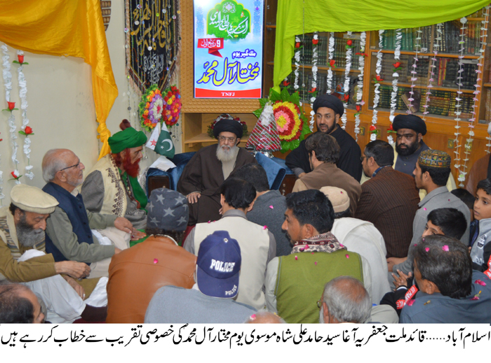 Prime Minister Imran Khan set a good example by highlighting Kashmir issue in United Nations - Hamid Moosavi ISLAMABAD, November 8: The Patron in-Chief of Supreme Shia Ulama Board and Head of Tehreek e Nifaz e Fiqah Jafariya Quaid e Millat e Jafariya Agha Syed Hamid Ali Shah Moosavi has said that Prime Minister Imran Khan set a good example by highlighting Kashmir issue in United Nations however, merging Kashmir in India after eliminating 35/A and 370 and dividing it into two parts by Modi is a slap on the faces of United Nations and other so called champions of human rights. Popularity of Kashmir’s freedom movement and Pakistan’s effective foreign diplomacy has exposed the cruel face of India. Pressure is mounting on India to resolve Kashmir issue in accordance with the UN resolutions. Despite Indian atrocities and 9-lac Indian army in occupied Kashmir, the political control of Hindu extremists is weakening. That is why Hindu extremists are involved in creating unrest in Pakistan to divert world’s attention from the situation in Kashmir. India has always been involved in sponsoring and supporting terrorism in Pakistan through her secret agency RAW and its undeniable proof is the red-handed arrest of Kulbhoshan Jadev and his confession. World must remember that Pakistan, India and Kashmiris all three are the parties in the disputed Kashmir. Holding plebiscite in East Timor, South Sudan but not offering the same to Kashmiris and Palestinians is a big question mark? The very first builder of Hazrat Imam Hussain ibn-e-Ali (A.S) Hazrat Mukhtar Saqafi stood against the history’s biggest Tauheen e Risalah in Karbala and kissed martyrdom. To revive Mukhtar’s spirit of sacrificing life for the motherland and raise peaceful voice of protest must be raised against Gustakhan e Rasool (PBUH&HP), Imam Mehdi (A.S), Ahl-e-Bait e Athaar (A.S), pious Sahaba Kibar o Umhaat ul Momineen (R.A). He said this while addressing to a special program aof Youm e Mukhtar e Aal e Muhammad (PBUT). The Quaid e Millat e Jafariya Agha Moosavi noted that India is not only oppressing Kashmiris for the last seventy-two years but for the last four centuries while the oppressed Kashmiris instead of getting their right of self-determination, are victims of atrocities by our eternal enemy. Hindu extremists are playing holi with their blood however, brave Kashmiris have kept the flag of resistance waving against Indian aggression. He said this history stands witness that India forcefully and illegitimately occupied a large part of the state of Jammu Kashmir and staged a drama of conceding the state with India through the fake signatures of Maharaja because if the signatures were legitimate then Nehru would never have taken Kashmir dispute to United Nations and never had agreed to the right of self determination for Kashmiris as on multiple occasions, India promised to hold plebiscite in occupied Kashmir. Later, Nehru despite presence of UN resolutions kept creating hurdles in peaceful settlement of Kashmir dispute and gave false logics to declare Kashmir as integral part of India. Agha Moosavi said that following Israeli strategy, India has been exerting full force to convert Muslim majority of Kashmir into minority. More important is that people from other states are being settled and employed in occupied Kashmir while locals are getting unemployed. India is in fact the biggest terrorist of the region and the chief supervisor of terrorism. He said that the occupied Kashmir valley is consistently under siege and curfew, businesses have shut, food shortage, and educational institutes are converted in garrisons. Occupied Indian army is oppressing innocent Kashmiris hence, the rulers and politicians of Islamic world must adopt a strong stance about Kashmir and Palestine to support Pakistan like China, Turkey, Malysia, and Iran however, Arab League, 39 states alliance and OIC remained unmoved. He stressed that unresolved issues of Kashmir and Palestine is because of divided Muslim rulers therefore, international organizations including United Nations, British and European communities must play their role in this matter. Government of Pakistan must activate Kashmir committee and take all other steps to expose real face of India involved in atrocities in occupied Kashmir. |