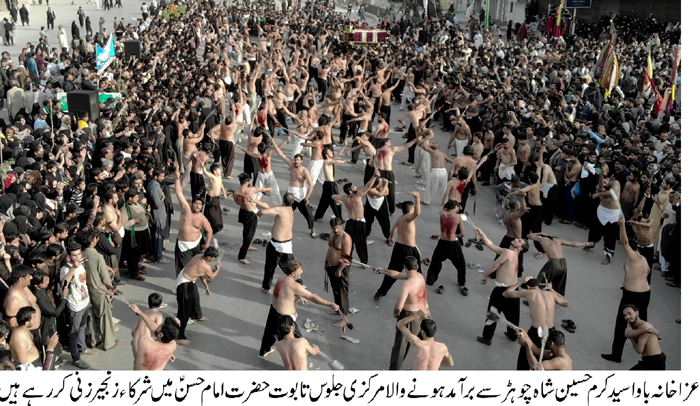 ISLAMABAD, October 29: The central procession of Taboot, Zuljinah and Alam Hazrat Abbas Alamdar (A.S.) was taken out from the Aza Khana Syed Karam Hussain Shah Kazmi, Peshawar Road, Chaur Harpal. The processions taken out from the residences of Syed Inayat Hussain Kazmi, Syed Anwar Hussain Kazmi, Haji Tanvir Hussain Kazmi, Allama Zahid Abbas Kazmi, and Fazal Abbas merged into the main procession when it reached Chaur Chowk where the mourners performed heavy zanjeer-zani under the leadership of Syed Qasim Ali Shah to pay the pursa in the Bargah-e-Risalat and Imamat. Later, a Majlis-e-Aza was organised at Malik House in which thousands of mourners participated. Central TNFJ Secretary Azadari Aala Hadier addressing the mourners on this occasion presented the special message of the Quaid-i-Millat Jafariya Agha Syed Hamid Ali Shah Moosavi in which he said that the Muslim Ummah is forgetting the path preached by the Rasool-e-Khuda (SAAW) as a result of which all Muslim resources are being trampled by the colonial powers, westernism is spreading in Muslim States while Islamic Sha’air are being wiped out. He said that ‘Ihsan’ is returned by ‘Ihsan’ but he lamented that Rasool (SAAW) who pulled out the humanity from ignorance and honoured them, and who termed Hassan (A.S.) and Hussain (A.S.) as his son and kept them on his shoulders but unfortunately they have today forgot the Wisaal of that Rasool (SAAW) and the Shahadat of his elder grandson Hassan Mujtaba (A.S.) is tragic. He said the silence of the Muslim Ummah and the media on the Youm-e-Wisal of Holy Prophet (SAAW) and the Youm-e-Shahadat of Hazrat Imam Hassan (A.S.) poses a question mark. He expressed his shock that symbols of forefathers of the Rasool (SAAW), Ahle Bait Athaar (A.S.) and pious Sahaba Kubaar (R.A.) have been wiped out from Jannatul Baqee and Jannatul Moallah in the name of expansion. The mazar of Hazoor’s (SAAW) daughter Hazrat Fatima (S.A.) was bulldozed. He said we desire to make it clear on the brotherly country of Saudi Arabia that wiping out the Sha’air Allah is forgetting the ‘Ihsan’. The expansion work could have been undertaken even by keeping the symbols of Ahle Bait Athaar (A.S.), Azwaaj-e-Mutaheraat (R.A.) and Sahaba Kubaar (R.A.). He said giving respect to the Nabavi symbols is not ‘shirk’ rather bowing down of Muslim rulers before the colonial power is so. He made it clear that we seek help from Allah through Anbia-e-Karaam (A.S.), Aaima Masoomin (A.S.) and Aulia Allah. He said the only option to stop Zionism and colonialism is to give priority to Islamic Sha’air and religion’s Mashaheer instead of personal interests. He said we have no conflict with anyone, Muslims are brethren with each other and like a one body; if any of its part is affected the whole body becomes affected. He said no geographic boundaries are in way of Islam. He said the history stands witness that Rasool (SAAW) who was ridiculed and degraded took Hassan (A.S.) and Hussain (A.S.) to Mobahila as his sons; Christian accepted them saying that these are the personalities on whose pointation even the mountains can leave their place. Therefore they did not go into Mobahila with the Holy Prophet (SAAW) and accepted to give ‘Jazia’. He said the Rasool-e-Akram (SAAW) also gave preference to peace, here too. The Quaid-i-Millat Jafariya Agha Syed Hamid Ali Shah Moosavi in his message said that there is important need to practically follow the seerat-e-Nabavi and Asswah of Hazrat Imam Hassan Mujtaba (A.S.) to get the world rid of terrorism and unrest. Presenting purss in the Bargah of Khatoon-e-Jannat on the Wisal of her father Holy Prophet (SAAW) and son Hassan Mujtaba (A.S.) reiterated his resolve to keep on following the path bestowed on them by the Paighambar-e-Islam (SAAW) and Imam Hassan (A.S.) and will give priority to peace and tranquility on everything come what may as in it lay the welfare of the humanity and failure of enemies of human beings. Meanwhile, a resolution adopted on the occasion, termed the silence of electronic and print media on the occasion of Youm-e-Wisaal of the Nabi (SAAW) and Youm-e-Shahadat of Hazrat Imam Hassan Mujtaba (A.S.) food for thought. The resolution demanded from the government to take notice of the problems being faced by Azadaran at the hands of the lower echelon administration. It said that rulers should keep in their mind that the Hussaini spirit increases manifold if is suppressed. There is need to spread the Zikr-e-Hussain (A.S.) and not to stop it so as to promote the spirit of freedom, and dignity of humanity, therefore the cultural invasion against Zikr-e-Hussain (A.S.) should be stopped instead of imposing restrictions on it. The resolution demanded from the government to announce public holiday on 28 Safar on the Wisal of Khatmi Martabat (SAAW) and the Shahadat of Hazrat Imam Hassan (A.S.). It also demanded restoration of historic Taburrukat at the Marqad of Sultan Al-Fuqara Hazrat Bari Imam (R.A.) like before. The resolution lamented that the Federal Ministry of Interior and provincial governments did not set up Muharram Azadari Cells which they used to set up earlier. The resolution reiterated resolve to give priority to Azadari over all other matters till 8th Rabiul Awwal in accordance with the policy of the Markaz-e-Tashih and the Code of Azadari. It demanded special security arrangements to all programmes till 8th Rabiul Awwal including the programmes of Shahadat of Imam Hassan Askari (A.S.) and the Alwidah programmes of the Ayyam-e-Aza. The resolution reiterated resolve to offer any sacrifice for the mission of Wila and Aza and for achievement of religious rights on the call of Quaid-i-Millat Jafariya Agha Syed Hamid Ali Shah Moosavi. Later, the procession concluded at Darbar Shah Piyara Kazmi Al-Mashadi after marching through its designated route where Dua and Ziarat was recited. Ibrahim Scouts set up medical camp to provide first aid to the Matamdaran during the 