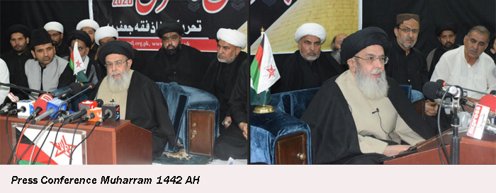 ISLAMABAD, August 22: Addressing a crowded press conference at Headquarter Maktab e Tashayyo the Chief of Tehreek e Niafaz e Fiqah Jafariya Quaid e Millat e Jafariya Agha Syed Hamid Ali Shah Moosavi announced the code of Azadari for Muharram ul Haram. Restrictions on new programs of Majalis and mourning procession are unacceptable. If new cities, Madaris, Masajid can be built than why the new programs of Azadari and Meelad ul Nabi cannot be held? Why is their restriction on in-house Majalis? Immoral and unethical programs are allowed, non-Muslims can also worship then why are the Shias not allowed to hold their worship programs? Azadari is our jugular vein and will never be compromised. We are the followers of Ali (A.S), we can die but will never let Meelad or Azadari die down. We will not allow anyone to control Pakistan. Register as many FIRs as you want, or even hang us to death, we will never refrain from bringing out the processions of Meelad and Azadari. Tahaffuz e Bunyad e Islam bill has reached where it came from. In presence of the 1973 constitution, there is no need for any bill. We don’t accept any unconstitutional institution including Muttehida Ulama Board. Constitution must be followed rather than making it a follower. None of the rulers and politicians will be able to retain their positions if he/she accepts Israel. We are not the stooges of Iran or Arabs and only follow the ideology given by Quaid e Azam Muhammad Ali Jinnah for Palestine and Israel. How can Muslim rulers who do not even take a bite without seeking permission from the colonial powers, disobey them? The way we respect Sahaba (R.A) is unmatchable. Lobbies are working to misguide people. Mosad’s agent using the name Ayesha is working to create biases on Social media. Zionists are trying to make Muslims fight against each other. Muslims must stay cautious. Why exactly the bills of different kinds are introduced in Punjab only? the leftovers of the dictator are trying to create sectarianism. The second Caliph Hazrat Umar ibn e Khatab was buried before Muharram but the day of his martyrdom was included in Muharram to deliberately create sectarian rift. Answering different questions, he said that whoever will follow the footsteps of the holy Prophet (PBUH&HP), Ahl-e-Bait (A.S), pious Sahaba e Kibaar (R.A), he will be saved from diseases like Corona. Closure of Khana Kaaba and other sacred places is a test as well as the ultimate result of bad deeds of the Muslims. We are associated with the holy Quran and Ahl-e-Bait (A.S) in accordance with the will of the holy Prophet (PBUH&HP). Everyone must be allowed to state his ideology however, it must not be imposed on others. All terrorist groups are operating using new names. Proscribed groups sit with the minister of religious affairs which is like wasting the blood of martyrs. Those who sacrificed their lives and honor for Pakistan cannot see Pakistan being looted. We do not fear death. We will neither compromise on religion nor shall we accept any intervention in Azadari even if our tongues or limbs are chopped off like Meesam e Tammar. Answering a question, Agha Syed Hamid Ali Shah Moosavi said that only the economically strong countries can have a successful foreign policy. Reason for the unsuccessful foreign policy lies in begging from others. OIC acts as a maid of certain kings which is why it does not summon a meeting on Kashmir. To form a Medina-like state, path of Sheb e Abi Talib (A.S) need to be followed and have a heart like the hearts of Ahl e Bait (A.S) and pious Sahaba. The greatest leader of Pakistan is Quaid e Azam Muhammad Ali Jinnah and only his policy must be followed. Accept to live hungry rather than compromising national interests. The axis of unity is the sacred personalities of the holy Prophet (PBUH&HP), Ahl-e-Bait e Athaar (A.S) and pious companions (R.A). Maktab e Tashayyo has been a victim of discrimination since long. No leader was found after Quaid e Azam however, those who showed up were killed. Foundation of Pakistan is La ilaaha ilallah while the foundation of La ilaha illallah is Imam Hussain (A.S). Pakistan will stick to Quaid e Azam’s ideology, no other ideology will be allowed. We respect all schools of thought including minorities. Breaking the Ottoman Sultanat was part of the greater Israel agenda. Most of the Muslim countries have accepted Israel and only announcements are due. If Modi had agreed to Trump’s offer of mediation on Kashmir, then Kashmir would also have ended up like Palestine. Everyone must remember that all Muslims are united. Our religion, Qibla, Prophet, and holy book is same. We will stay united to thwart conspiracies of common enemy and will prove to the evil world that no power can disintegrate us. It is a dilemma that Muharram is presented as a threat in Pakistan while all forces start impeding Azadari programs. Agha Syed Hamid Ali Shah Moosavi said that following the code of Azadari will be a source of dignity for the whole nation while also fail the enemies of Pakistan. 19-Points Code of Azadari included following points: 1. People should keep a close eye on the enemies of religion and motherland and remain vigilant. 2. The beliefs and ideologies of others should not be interfered with and the Shuhada-e-Karbala should be offered devotion by sticking to their own ideologies. 3. Should respect each other’s rights by recognizing all schools of thought giving them respect. 4. Discrimination in the name of religion, school of thought and language should be prohibited. 5. Calling recognized Muslim schools of thought as non-Muslims should be considered cognizable offence. 6. Precautionary measures may be adopted to remain safe from corona because precaution is the source of salvation. 7. Full protection should be provided through ensuring protection to processions under the Junejo-Moosavi Agreement signed on May 21, 1985. 8. Ulema Karaam, Waizeen and Zakireen should keep an eye on brotherhood and unity,