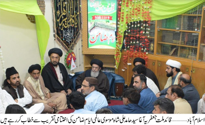 ISLAMABAD, July 5: The Patron-in-Chief of Supreme Shia Ulema Board Quaid-i-Millat Jafariya Agha Syed Hamid Ali Shah Moosavi has said that the critical injury caused to the motherland on July 5, 1977 is not yet healed. It is necessary to root out biases for the stability of the motherland which were nursed by tyranny. The international community should listen to the woes of Kashmiri children sobbing on the innocent bodies of those who are martyred by Indian forces. India is touching new heights of oppression but the international conscience is in deep slumber. The Indian expansionist designs may lead to nuclear war. Pakistan, China and Nepal may adopt a joint strategy against Indian atrocities. Muslim rulers who are restless for the places of worship of other religious entities should also give attention to the restoration of dignity and the holy shrines of the benefactors of Islam. The dilapidated condition of holy shrines of Ummahatul Momineen, Sahaba Kubaar, Ahle Bait Athaar and the Khatoon-e-Jannat complain of inattention on the part of Muslim Ummah. The culture of calling names has been spread by those who are being nursed on foreign money. The Chief Justice should take notice of administration’s double standards viz. contempt law. There is need to adopt the seerat of Imam-e-Zamin Ali Al-Raza (A.S.) to thwart attacks being carried out on the Islamic truthfulness. These views were expressed by him while addressing the concluding ceremony of the Ayyam-e-Zamin observed in connection with the Youm-e-Wiladat Purnoor of Imam Ali Ibne Musa Al-Raza (A.S.). A memorial shield ‘Shams Al-Shamoos’ was also presented to the Quaid-i-Millat Jafariya on behalf of Wal-Asr media cell. Agha Moosavi said there was no example of Imam Jafar-e-Sadiq’s (A.S.) grandson i.e. Imam Ali Raza (A.S.) in the era of knowledge and arts. The history books are replete with such events. Imam Ali Raza (A.S.) forced many atheists and others to accept the truthfulness of Islam through his arguments that is why he was bestowed with the title of ‘Alim Aal-e-Muhammad’. He said the sayings of Imam Raza (A.S.) with reference to Tibb and nutrition are derived from Islamic Tibb from which the world of Tibb is deriving benefits even today. He said Khalifa Mamoon-ur-Rashid Abbasi had ordered to write the Tibbi journal of Imam Ali Raza (A.S.) with Aab-e-Zar. He said Imam Ali Ibne Musa Raza (A.S.) used to organize special Azadari Majalis for Zikr of Shahadat-e-Hussain (A.S.) and also used to direct all his followers to do so. This Zikr-e-Hussain (A.S.) is the abode for the oppressed the world over and the symbol of fear. The Quaid-i-Millat Jafariya Agha Syed Hamid Ali Shah Moosavi said that there is a saying of Imam Ali Raza (A.S.) the one who will make his Nafs accountable will remain in profit, the one who will commit negligence with remain in loss, and the one who will fear from Allah he will remain fearless from others will become a visible person. He said if the rulers and politicians adopt the process of self-accountability then not only July 5 like black measures could be controlled rather the motherland will touch the new heights. |