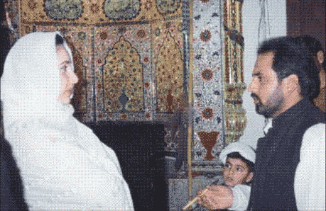 Shaheed e Jamhooreat (democracy) Ex Prime Minister Mohtrama Benazir Bhutto talking to the TNFJ’s spokesman. Just after the murder of her brother Murtaza Bhutto, when she was going through a depressing period of her life, she visited Ali Masjid and indirectly met with Quaid-e-Millat i.e. through a Mehram, and requested for prayers |