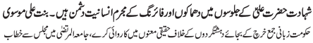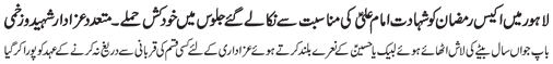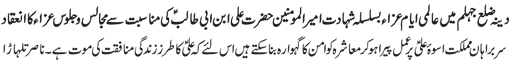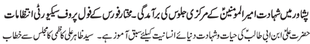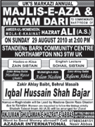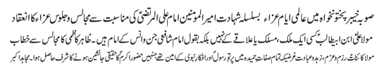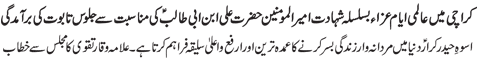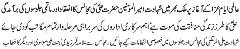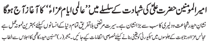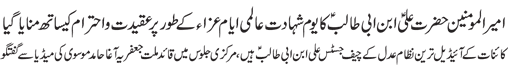 RAWALPINDI, September 2: The Youm-e-Shahadat of Amirul Momineen Hazrat Ali Ibne Abi Talib (A.S.) was observed throughout the country with religious spirit, devotion and respect on Wednesday culminating the programmes of “International Ayyam-e-Aza”.