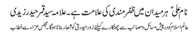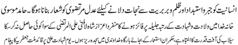 RAWALPINDI, September 01: The Quaid-i-Millat Jafariya Agha Syed Hamid Ali Shah Moosavi has said that there is an important need of making Adl-e-Murtazvi as our symbol to get the humanity rid of oppression, suppression and brutality.