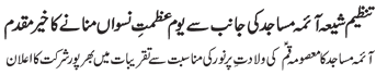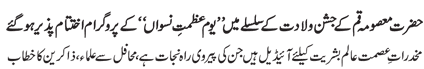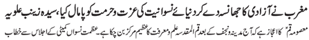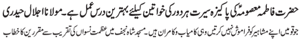 RAWALPINDI, October 7: Quaid-i-Millat-i-Jafariya Agha Syed Hamid Ali Shah Moosavi has said that seerat of chaste ladies of Khanwada-e-Risalat is complete pattern for women the world over, and by following this women can achieve respectable status in the society.