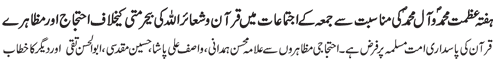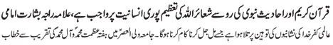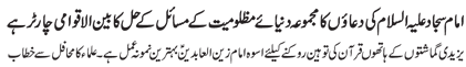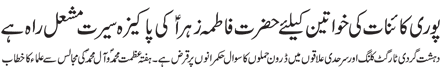 RAWALPINDI, April 17: The pious character of Hazrat Fatimah Zahra (pbuh) is a role model for the women of the world to follow; Muslim rulers are busy in saving their rule only, which poses a question on their status as being Muslim leaders – Address of Ulama to the gathering of “Hafta e Mohammad O Aal e Mohammad (pbut)” | |||