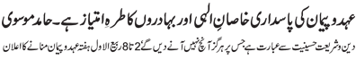 RAWALPINDI, February 5: Quaid e Millat e Jafariya Agha Syed Hamid Ali Shah Mousavi, - While announcing the “Hafta e Ehd o Paiman” 2nd – 8th Rabi ul Awwal, in connection with the Martyrdom of Imam Hassan Al Askari (pbuh)- said that keeping promises and vows is the sign of brave and of those, chosen by ALLAH.