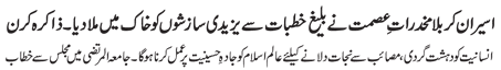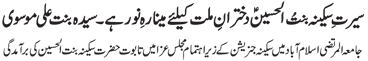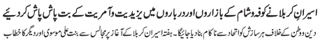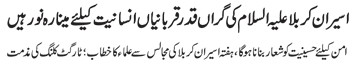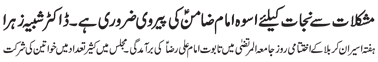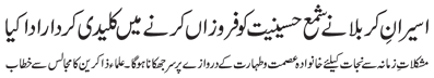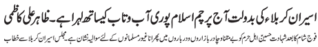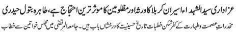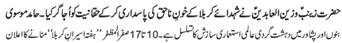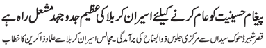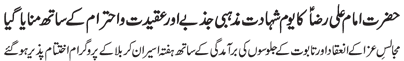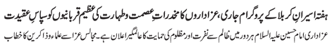 RAWALPINDI, January 16: Programmes of Majalis and Jaloos to observe Hafta e Aseeran e Karbala started throughout the country as announced by The Quaid e Millat e Jafariya Agha Syed Hamid Ali Shah Mousavi. |