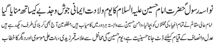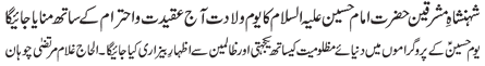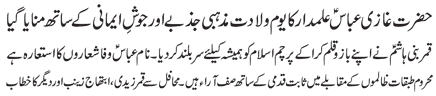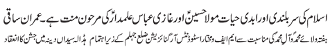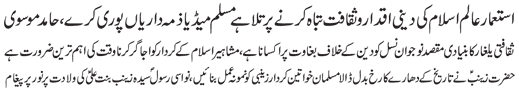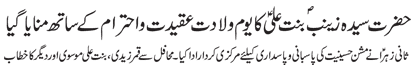 RAWALPINDI, July 4: Colonial powers were bent upon destroying the religious values and culture of the Islamic World, Islamic media is under the obligation to fulfil its responsibility in this connection - Message of the Quaid on the birth anniversary of the granddaughter of the Holy Prophet, Syeda Zainab Bint e Ali (pbuh) |
