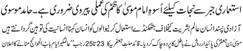 RAWALPINDI, June 23: The pious character of Imam Musa Kazim (pbuh) must be followed in order to get the world of humanity rid of colonial oppression – Quaid e Millat e Jafariya announces to observe Alamgeer Ayyam e Babul Hawaej from 23 – 25th Rajab