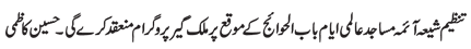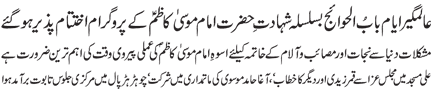 ISLAMABAD, June 25: Tanzeem Shia Aaima Masajid will arrange country wide programs on the occasion of Aalmi Ayyam e Babul Hawaej - Hussain Kazmi