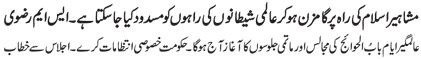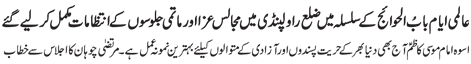 RAWALPINDI, June 26: International colonial plans can be failed by adopting the path of the pious personalities of Islam; Programmes of Majalis and Matami processions in connection with Aalmi Ayyam e Babul Hawaej will commence on Sunday; The government should make special arrangements - Address of S M Rizvi to the meeting