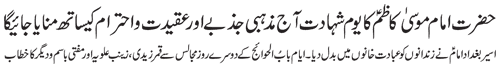 RAWALPINDI, June 28: Martyrdom anniversary of Imam Musa Al Kazim (pbuh) will be observed today with great respect and religious zeal; Captive Imam of Baghdad turned the prisons into places of worship; on the second day of Ayyam e Babul Hawaej, Syed Qamar Zaidi, Zainab Alviya, Mufti Basim and others addressed to the majalis