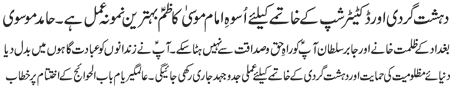 RAWALPINDI, June 29: The pious character of Hazrat Imam Musa Kazim (pbuh) is the best example to follow to confront terrorism and dictatorship; Prisons of Baghdad and tyrant rulers could not deviate Imam (pbuh) from the path of righteousness – Hamid Moosavi