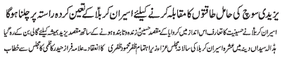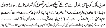 | RAWALPINDI, January 12: In order to pull the motherland out of the political swamp, the Judiciary should adopt the Justice of Murtaza (PBUH) Hamid Moosavi | |||