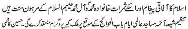 ISLAMABAD, June 11: Tanzeem Shia Aaima Masajid will arrange countrywide programs on the occasion of Aalmi Ayyam e Babul Hawaij - Hussain Kazmi | |||