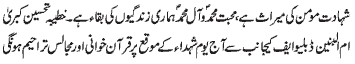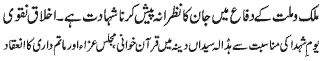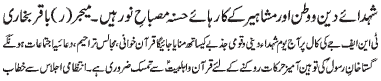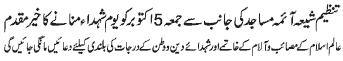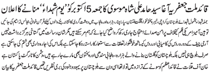 RAWALPINDI, October 4: Moosavi has announced the observation of Youm-e-Shuhada on Friday, October 5 to pay homage to the martyrs of the religion and motherland | |||