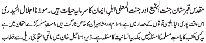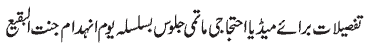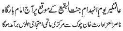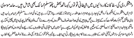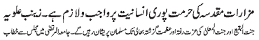 | ISLAMABAD, August 13: Organization of Shia Aima Masajid announces full and complete participation in mourning protests on 8 Shawal the “Day of Destruction of Janat ul Baqee”; the restoration of the former glory of holy shrines should be insured, the processions against the destruction of holy shrines will be led by the respected scholars - Hussain Kazmi | ||||