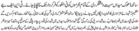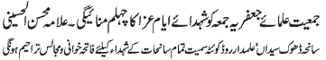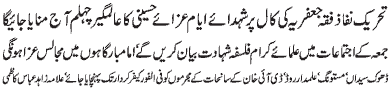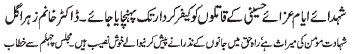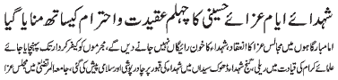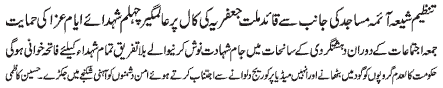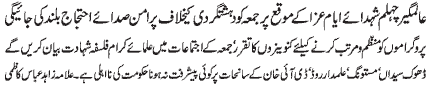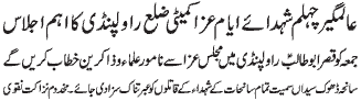 ISLAMABAD, January 30: A peaceful voice of protest against terrorism will be raised during the programs of Alamgeer Chehlum of the martyrs of Ayyam e Aza; Conveners appointed to organize the programs, scholars will highlight the philosophy of martyrdom during Friday sermons; lack of progress in the tragic incidents of Dhoke Syedan, Mastoong, Alamdar Road and D I Khan is a failure of the government