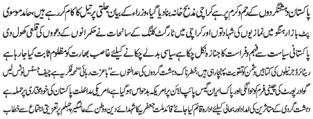 ISLAMABAD, February 2: Pakistan is on the mercy of terrorists and Karachi has been turned into a slaughter house; The incidents of target killings including Shahadat of Nimazis in Hangu and gory murder of Banori Town ulema have unveiled the claims of the rulers - Address of the Quaid-i-Millat Jafariya Agha Syed Hamid Ali Shah on the Chehlum of Shuhada e Ayyam e Aza