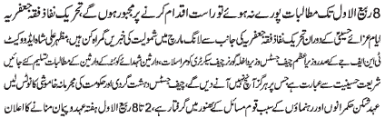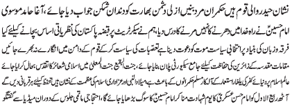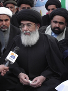 ISLAMABAD, January 20: We are the nation with the "Nishan e Haider"; the rulers should become brave; the archenemy, India should be taught a lesson – The Quaid e Millat e Jafariya Agha Syed Hamid Moosavi; Imam Hussain (PBUH) taught us a lesson to die on the path of Allah and not to cause sit ins; The TNFJ took over secretariat to save the very basic ideology of Pakistan; politics on the basis of language and sects is equivalent to death; the nation should not be pushed into the fire by promoting the politics of bias; the long term security plan should be formed to protect the pilgrims of the Holy Places; the dignity of the Islamic signs, the Jannat al Baqi and Janat al Muala should be restored; Milad un Nabi and Azadari are the signs of dignity of Islam for the safety of which no sacrifice will be spared; while commemorating the martyrdom anniversary of Imam Hassan Al Askari (PBUH) on 8th of Rabiul Awwal with which we will bid farewell to the designated days of grief of Imam Hussain (PBUH) - media talk of the Quaid e Millat e Jafariya during the procession of the Matami protest in Islamabad