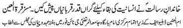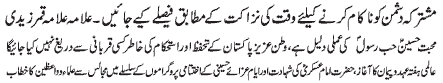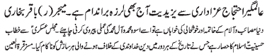 RAWALPINDI, January 16: In order to fail the conspiracies of the mutual enemy, decisions should be made according to the current sensitive situation – Allama Qamar Zaidi; love towards Imam Hussain (PBUH) is a proof of love of the Holy Prophet (PBUH & HHP); the universal week of Ehad O Peyman commenced; address of Ulema O Zakreen to the Majalis e Aza in connection with the martyrdom anniversary of Imam Hassan Al Askari (PBUH) and to farewell the days of grief of Imam Hussain (PBUH)