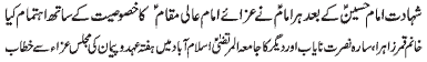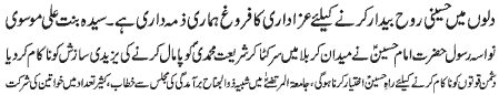 ISLAMABAD, January 16: In order to promote the spirit of Hussainiat, we are duty bound to perform Azadari; through his great sacrifice, Hazrat Imam Hussain (PBUH) defeated the Yazidi conspiracy against Islam; in order to confront enemies of Pakistan, the path of Hussainiat will have to be adopted - Address of Syeda Binte Ali Moosavi to the Majlis e Aza at Imam Bargah Jamia tul Murtaza
