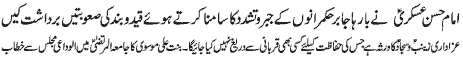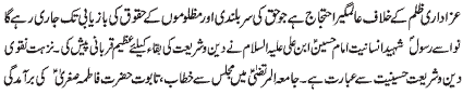 ISLAMABAD, January 22: Imam Hassan Al Askari (PBUH) many times bore difficulties of the captivity at the hands of the tyrant rulers; no sacrifice will be spared for the protection of Azadari, which is the legacy of Hazrat Zainab and Imam Sajjad (PBUT) – Address of Syeda Binte Ali Moosavi to a Majlis of the concluding days of morning of Imam Hussain (PBUH) at Jamia tul Murtaza Islamabad