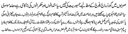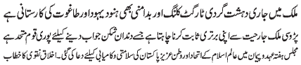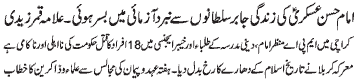 RAWALPINDI, January 19: Imam Hassan Askari (PBUH) confronted the tyrant rulers of his era all his life; the target killings of MPA Manzar Imam in Karachi, the students of the religious institute and loss of 18 lives in Khyber Agency is due to the incompetence of the government; the battle of Karbala is a turning point for the Islamic history - addresses of Ulema O Zakreen to the Majalis of Haftae Ehdo Peyman