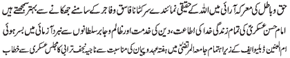 ISLAMABAD, January 19: In the battlefield, the representative of Allah would sacrifice their lives rather than bow down in front of tyranny; the whole life of Imam Hassan Askari (PBUH) was committed for obedience of Almighty Allah and to serve the religion while confronting the worst kind of tyrants of his era – address of Najia Najaf Turabi to the Majlis of Hafta e Ehad O Peyman at Jamia tul Murtaza