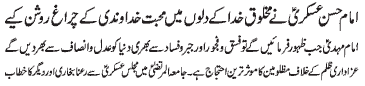 RAWALPINDI, January 21: If the Islamic world is looking for intersession of the Holy Prophet (PBUH & HHP) on the Day of Judgment then they will have to associate themselves with the pious progeny of the Holy Prophet (PBUT); today the martyrdom anniversary of Imam Hassan Al Askari (PBUH) will be observed throughout the country with great religious zeal and reverence; procession of Taboot and Amaries will be taken out across the country; the government should ensure special security measures