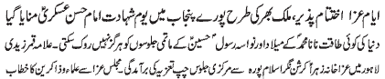 RAWALPINDI, January 22: Programmes in connection with the martyrdom anniversary of Imam Hassan Al Askari (PBUH) concluded throughout the country; the main procession of Tazia from Rawalpindi from Imam Bargah Hafazat Ali Shah and the main procession of Amaries brought out from Markazi Imam Bargah Islamabad; no sacrifice will be spared for the propagation of the message of Hussainiat; display of unity during Ayyam e Aza is appreciable