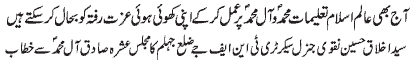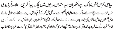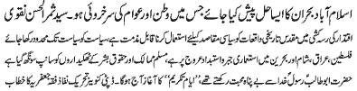 | RAWALPINDI, August 26: The solution of the Islamabad Crisis must be one which can lift the honour of the country and the nation - Samar ul Hassan Naqvi | |||