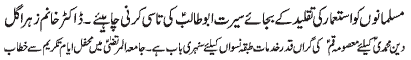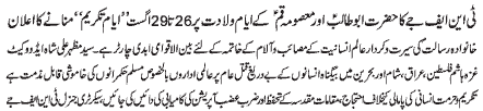 RAWALPINDI, August 24: TNFJ announced the observation of the birth anniversaries of Hazrat Abu Talib and Masooma e Qum (PBUT) from 26-29 August |